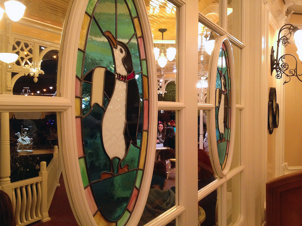 The Jolly Holiday Bakery has a lot of charm because of its Mary Poppins inspired décor. The doors have stained glass windows which depict the penguins. The floor has a mosaic that is reminiscent of Bert’s sidewalk drawings. You might be half awake while waiting in line to get your coffee, but there are many wonderful details to the restaurant.
