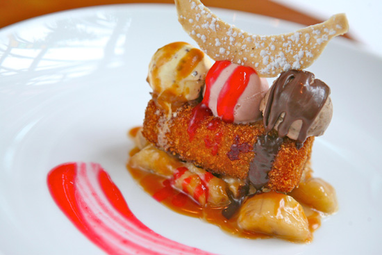 - Fried Banana Split Monte Cristo Sundae Raspberry and Chocolate Fudge Ice Creams, Toffee Nuts and Warm Caramel Rum Bananas