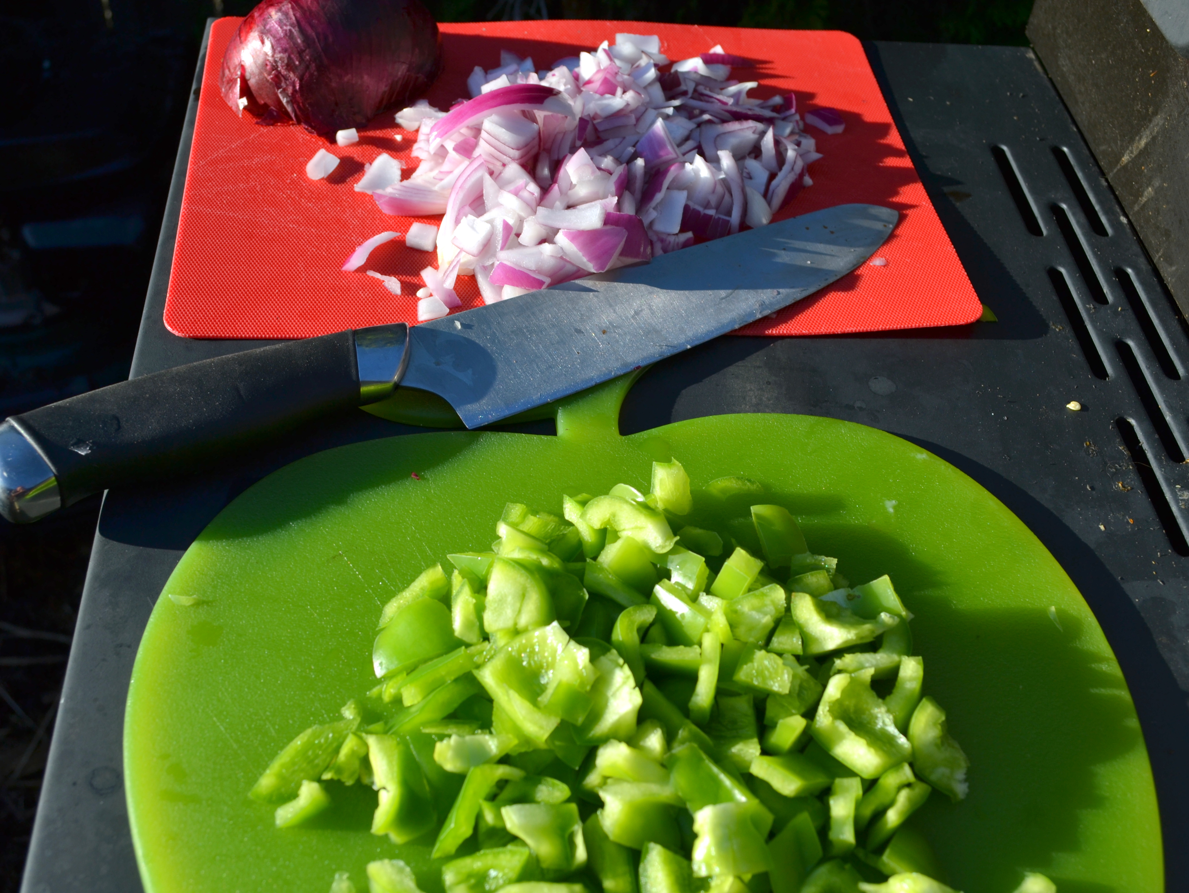 To keep things simple, I used a Pillsbury Pizza Crust and just followed their barbecue chicken recipe. The first step was to grill a couple chicken breasts (you need about two cups of meat) and to chop some green peppers and red onions. I was able to get the veggies chopped in the time it took the chicken to cook.