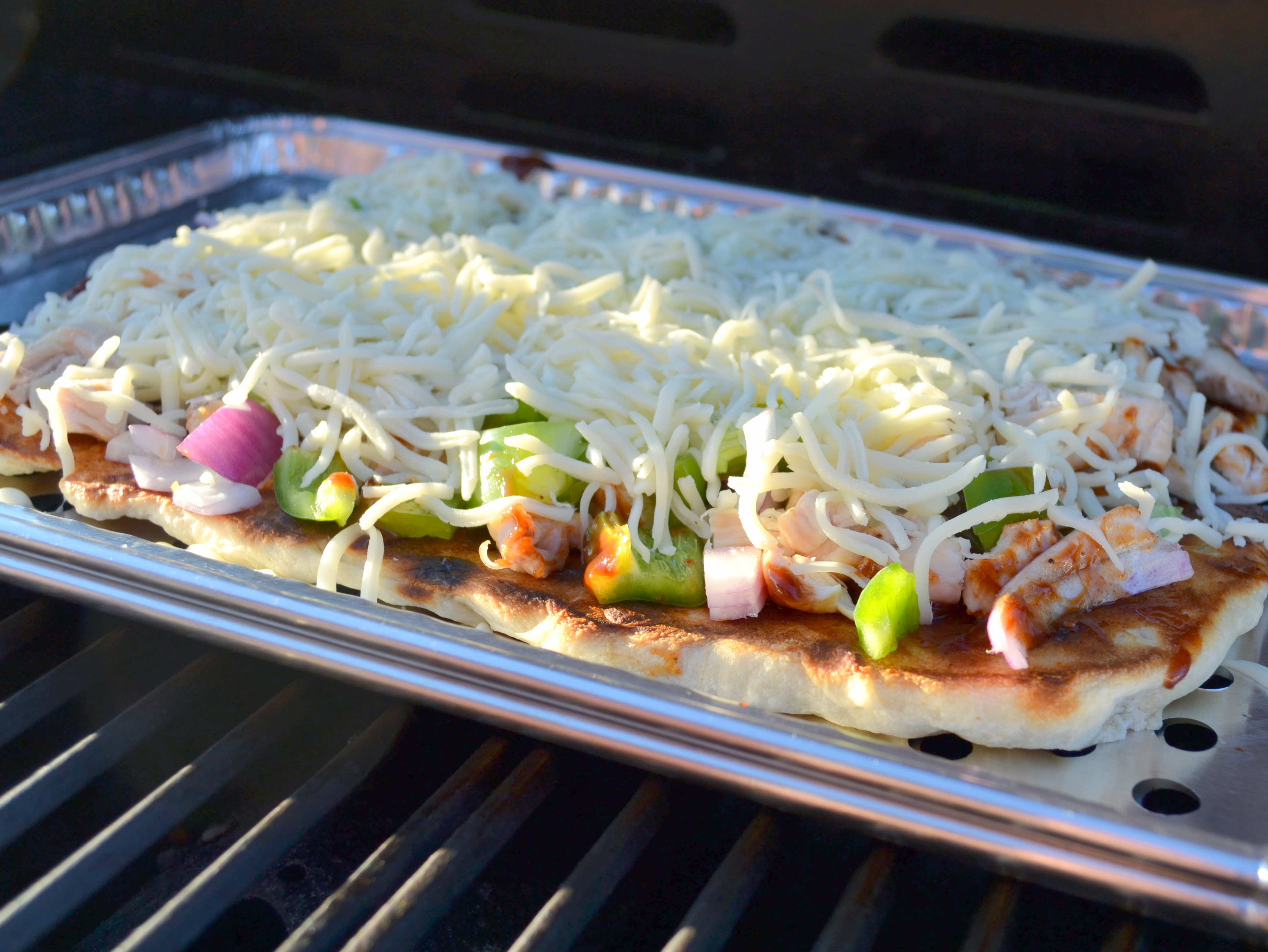 Before putting the crust back on the grill, it was time to add the toppings. First, you add a base layer of the barbecue sauce to the pizza. Pillsbury’s recipe calls for a little chili powder to be mixed into the barbecue sauce, which gave it a little kick. Cut your chicken into cubes and then sprinkle it onto the crust. Then add your cheese, onion, and green pepper. And finally, put that bad boy back on the grill.