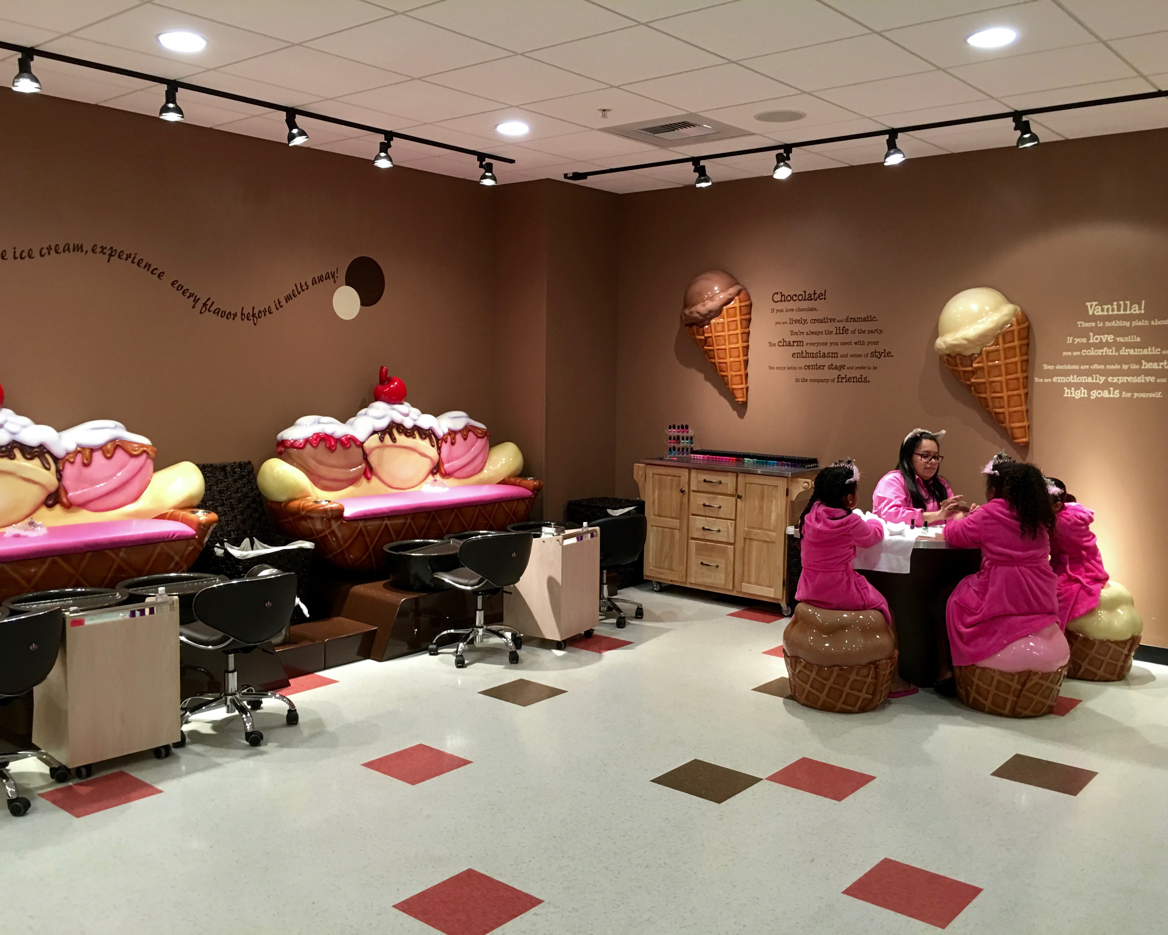 Scoops Spa is the perfect spot for birthday parties or to pamper the little princess in your family. Your child gets a fluffy pink robe, a tiara, and then chooses which of the ice cream themed scents they’d prefer. Most of the nail polish options have glitter, of course. I have visited three different Great Wolf Lodge locations and Scoops Spa is always one of the most popular spots. The best part is the free ice cream you get at the end of the spa treatment.