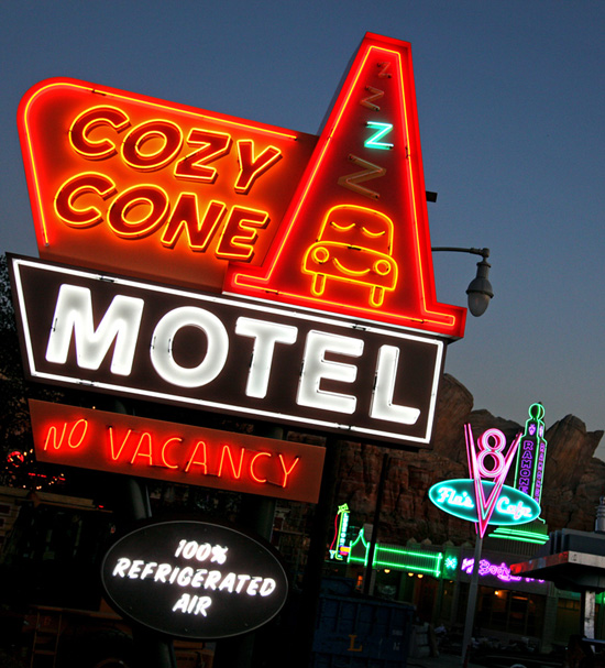 The adorable Cozy Cone Motel is a quick-service restaurant inspired by the quirky “wigwam” motels along Route 66. In the Cars Land version, each wigwam offers a different filled cone, such as “chili cone carne” or “cone on the cob.” Flavored popcorn is a fun offering at one of the five wigwams, including salt and vinegar, pickle, sweet and spicy, bacon and cheddar, and nacho cheese.