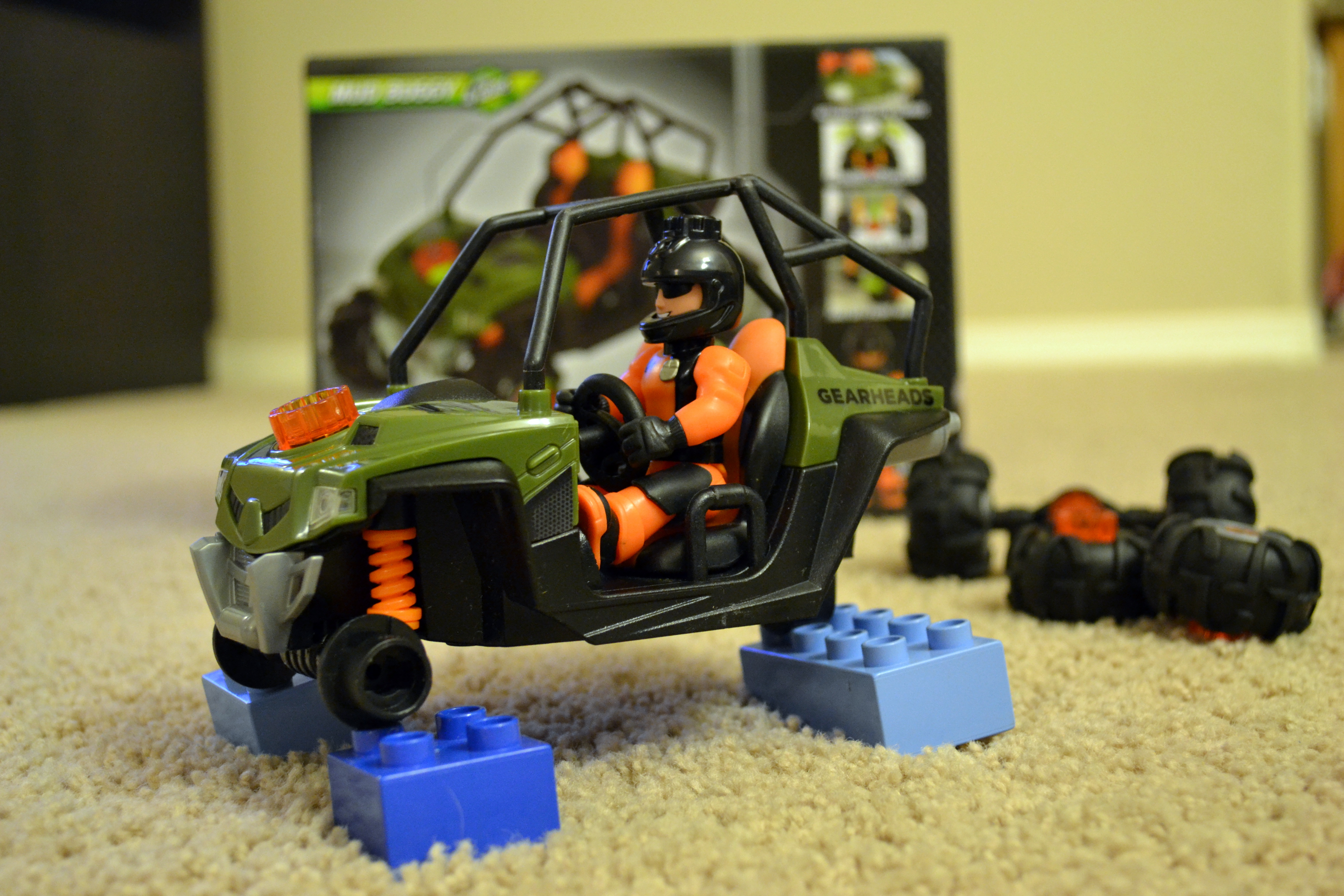 Using the gearhead guy (I wonder if he has a name), I was able to remove the wheels and the suspension system from the buggy. It was easy enough to put it all back together and then to tighten up the wheels, using the gearhead guy again as a wrench. On the hood of the jeep is a socket where you can activate the buggy’s lights and some sounds with a simple twist of gearhead’s melon.