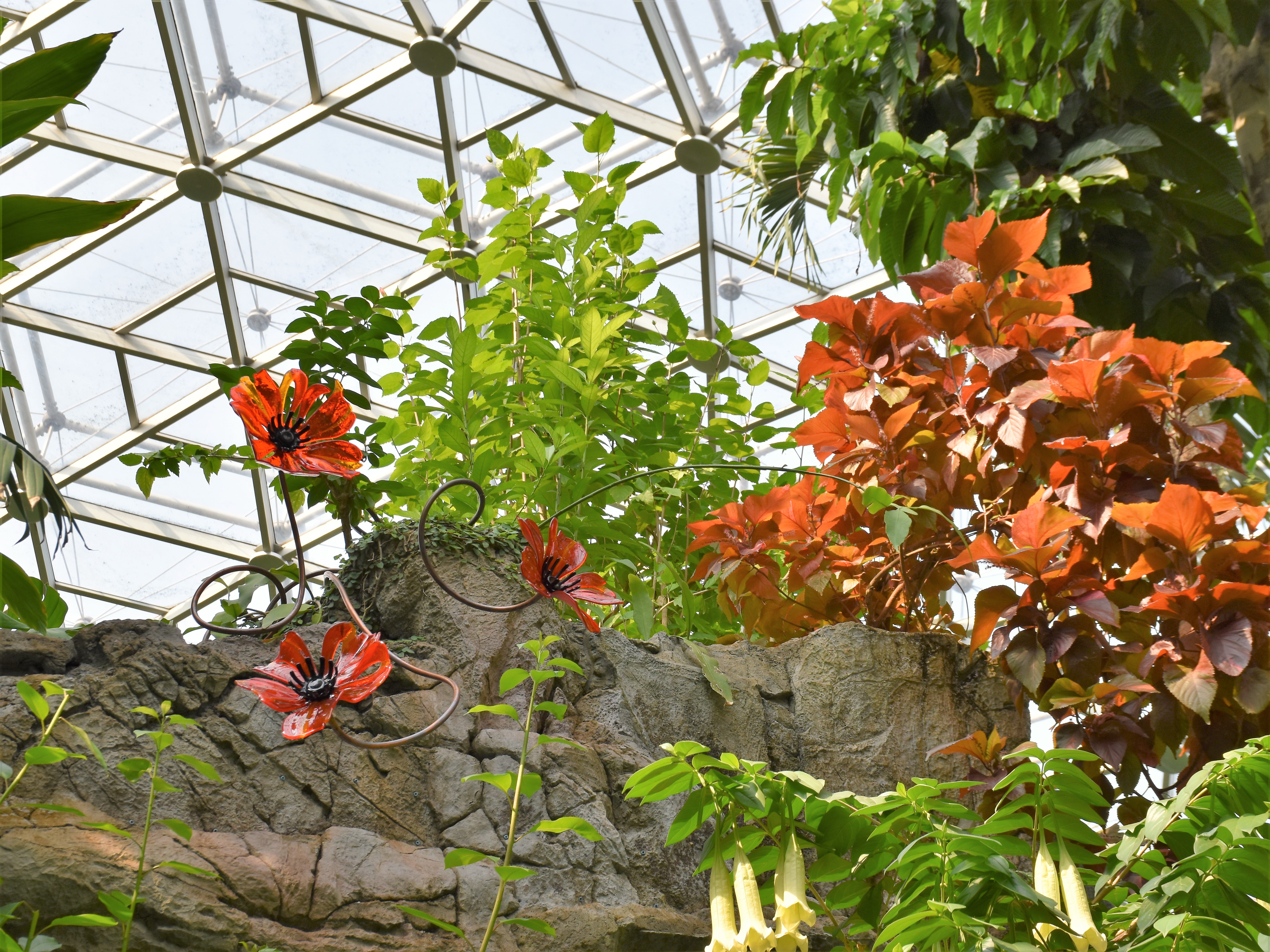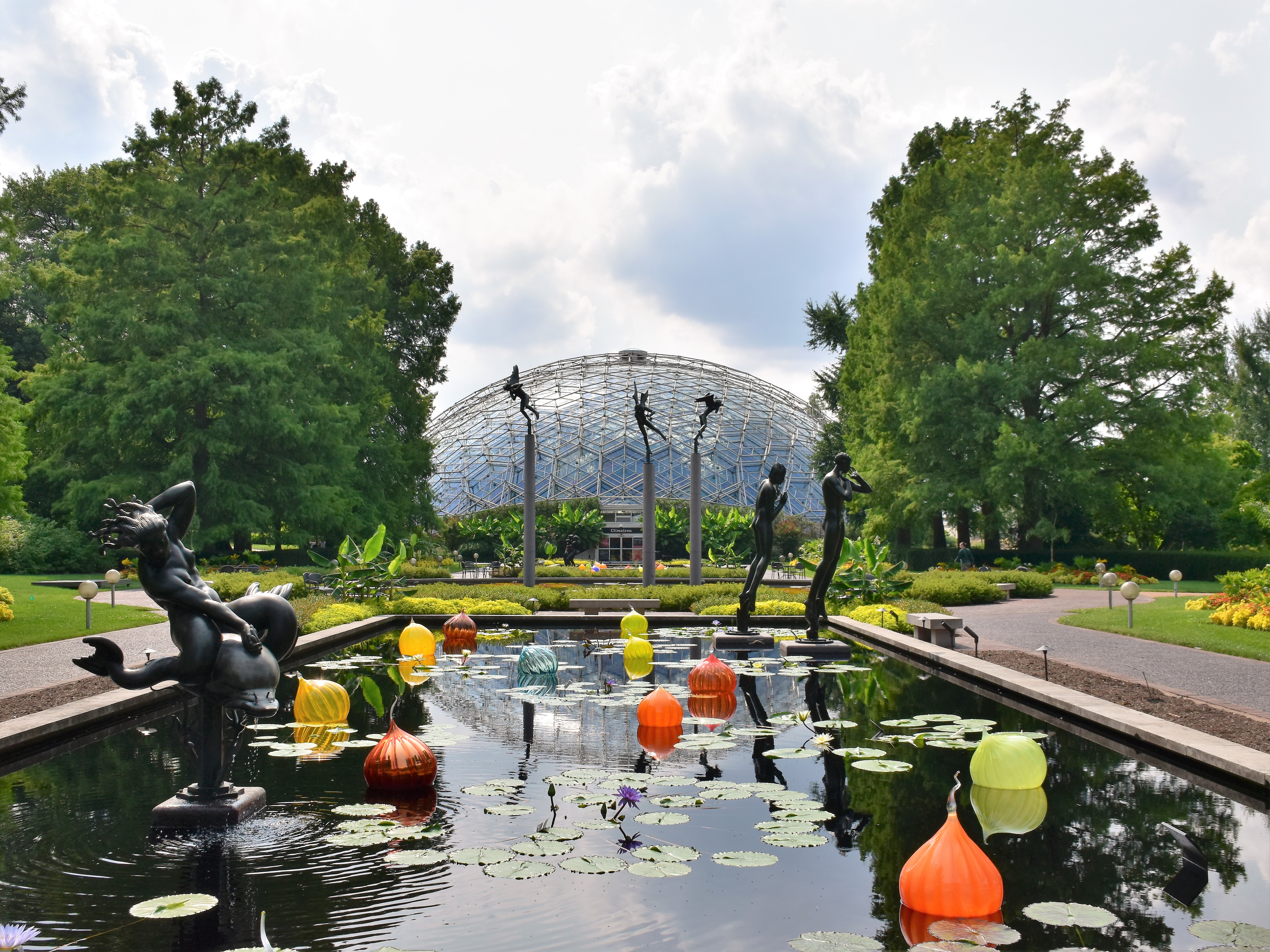 One of the most interesting items I learned was that the Missouri Botanical Gardens has a DNA Bank that tracks the genetic background of plants. It is like a genealogy tree that allows scientists to trace how a plant has changed over the years and where certain characteristics have been introduced. It was fascinating to hear about the work that went into this project. They also had the Garden of Glass art exhibit during my trip. You can see some of the glass flowers in the photo above and other pieces floating in the reflection pool below.