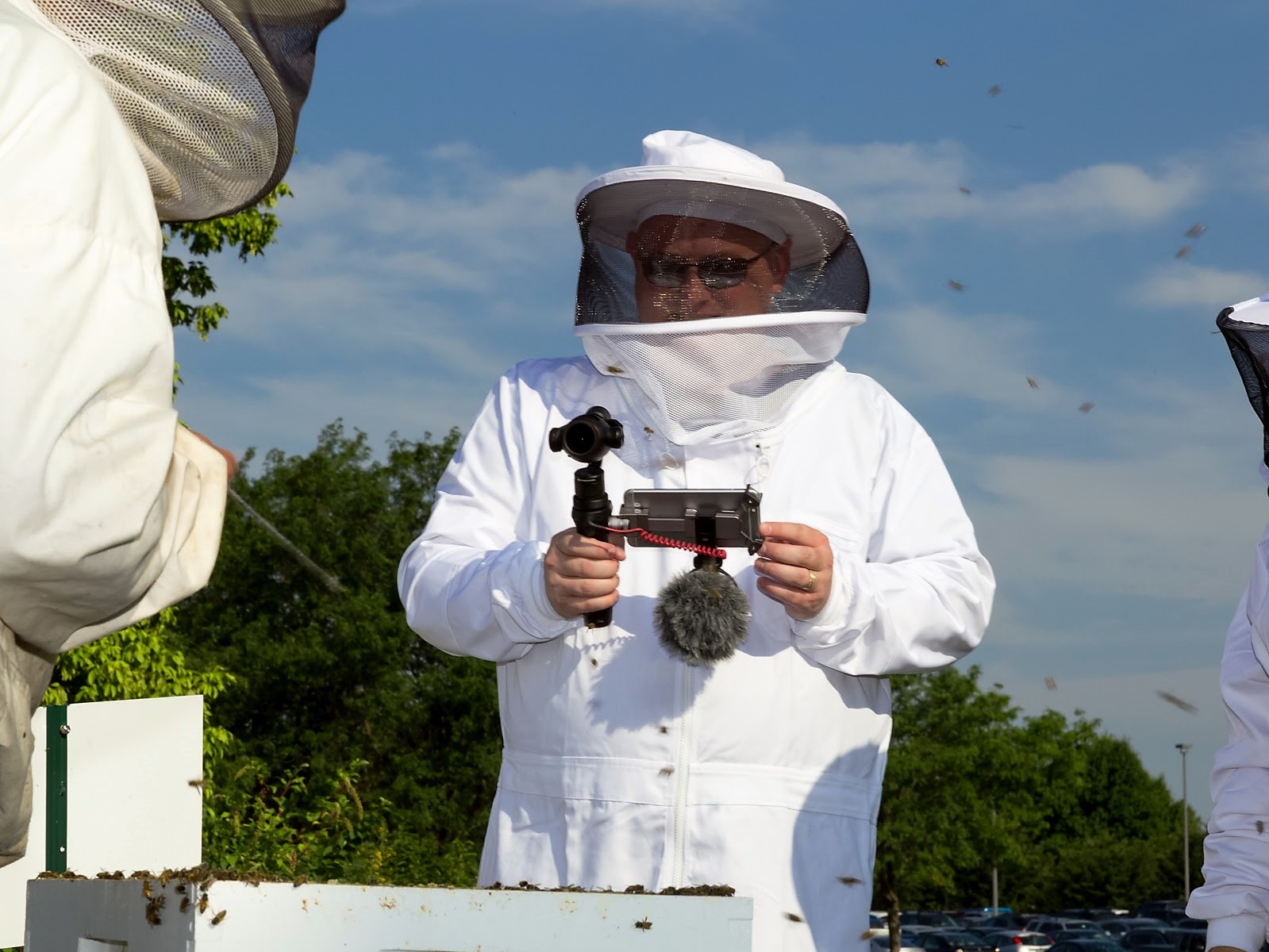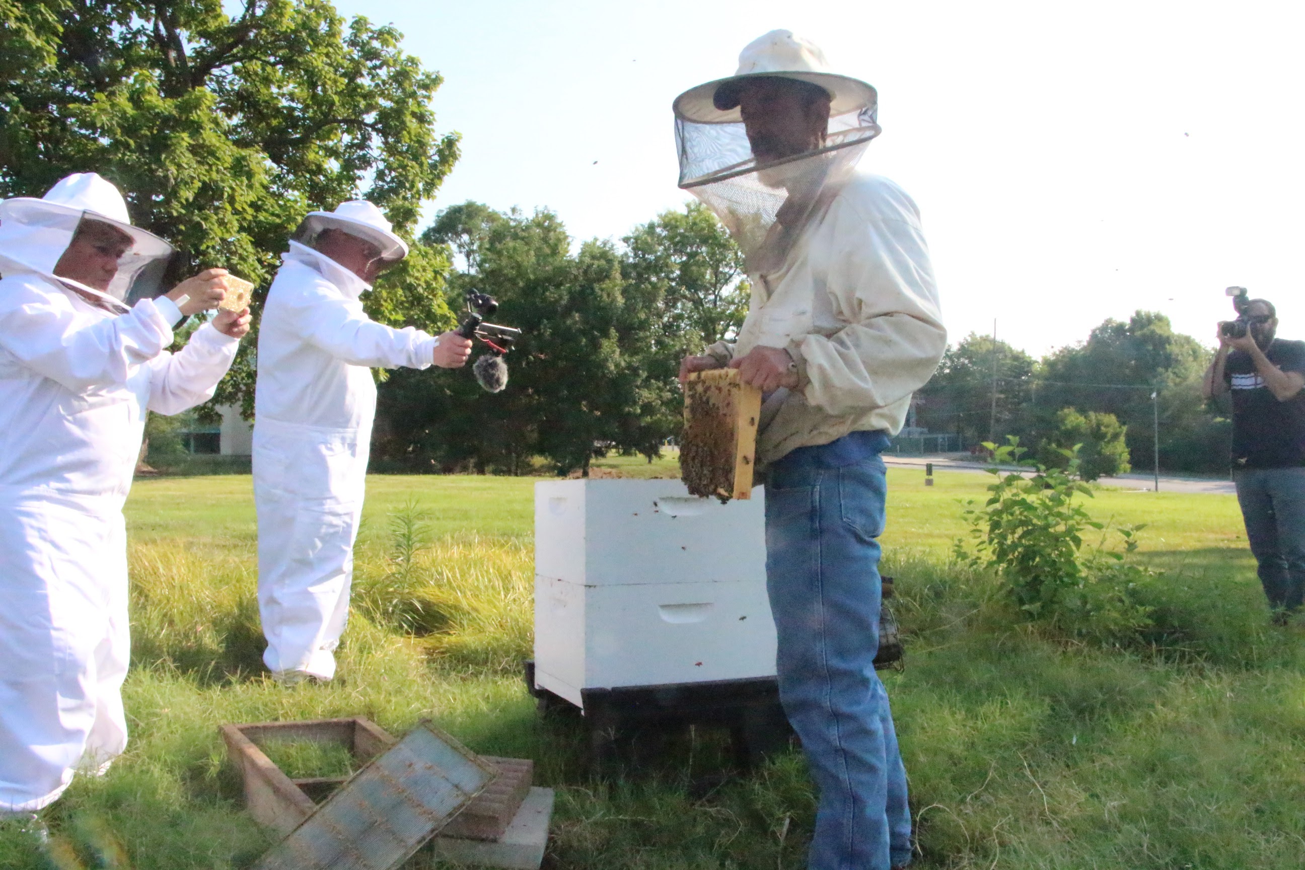 The next day I did something that was exhilarating, and terrifying. I put on a bee suit and got up close and personal with a bee hive. Jerry Hayes is Monsanto’shoney bee health lead and one of the leading authorities on the topic (check out the profile in Wired magazine). As the bees buzzed around us, Jerry gave a look inside the hive and told us about some of the environmental factors that have lessened the number of honeybees, such as the varroa mite. He encouraged use to plant more flowers in our garden. Flowers are nicer to look at than grass, and they attract bees, he said.